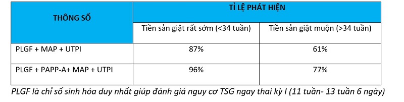 TSG được đánh giá thông qua chỉ số phát triển nhau thai ( PLGF) kết hợp với huyết áp (MAP), siêu âm xung động mạch tử cung (UTPI, Doppler), tiền sử thai phụ.