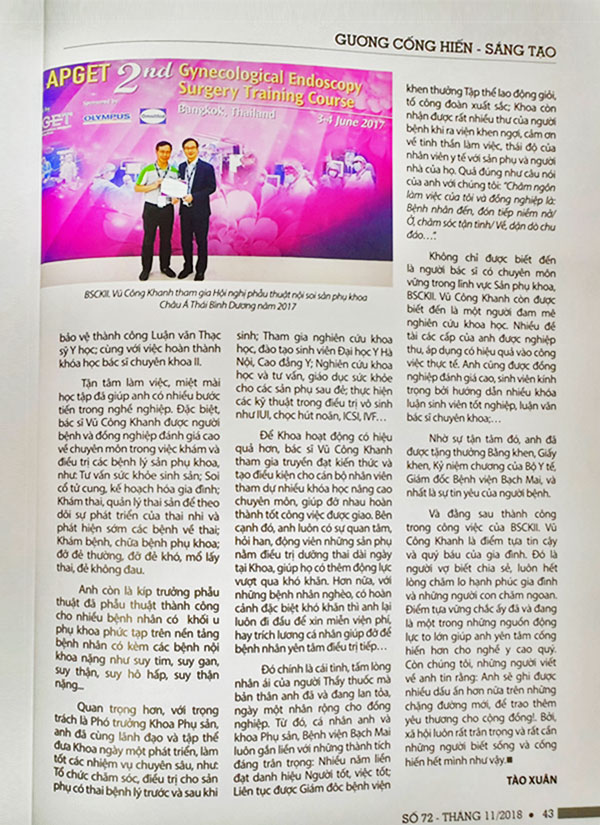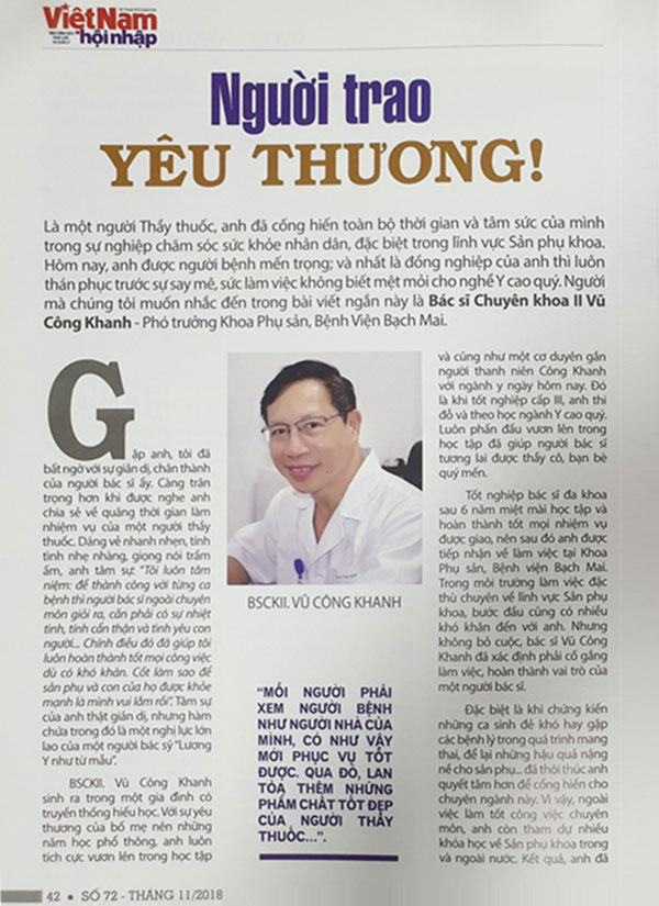 Bác sĩ Vũ Công Khanh đã gắn bó với chuyên ngành Sản phụ khoa qua gần 30 năm thực hành lâm sàng. Trong suốt quá trình lao động miệt mài đó, Bác sĩ Khanh luôn hoàn thành công việc trên mọi vị trí công tác, được đồng nghiệp và người bệnh tin yêu và có nhiều bằng khen và giấy khen, danh hiệu chiến sỹ thi đua nhiều năm liền…. Ông đã chăm sóc sức khỏe cho hàng ngàn thai phụ, trực tiếp đỡ đẻ sinh thường hay đẻ khó, phẫu thuật mổ lấy thai, hay các phẫu thuật mổ nội soi, mổ đường dưới, mổ mở điều trị các bệnh lý phụ khoa. Đặc biệt Bs Khanh là người thường xuyên mổ lại, xử lý các ca tai biến sau đẻ, sau mổ của tuyến dưới và các bệnh viện tỉnh chuyển về Bệnh viện Bach Mai. Bs Khanh cũng tham gia hội chẩn trực tuyến, triển khai các kỹ thuật mới, giảng dạy chuyên môn cho đội ngũ Cán Bộ Y tế trẻ trong các chương trình CME của Bệnh viện, giảng dạy cho các sinh viên Trường Cao đẳng Y tế Bạch Mai, sinh viên Đại học Y Hà Nội, các bác sỹ sau đại học của Trung tâm đào tạo Bệnh viện Bạch Mai và của Trường Đại học Y Hà Nội. Bs Khanh cũng là người có nhiều năm kinh nghiệm giảng dạy siêu âm sản phụ khoa của Bệnh viện Bạch Mai.